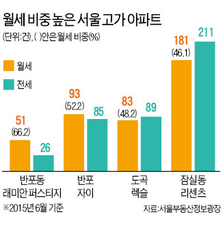 재건축 대상이 아닌 일반 아파트 중 집값이 가장 비싼 서울 서초구 반포동 ‘래미안 퍼스티지’와 ‘반포 자이’ 임대차 거래에서 월세 거래량이 처음으로 전세 거래량을 앞질렀다.