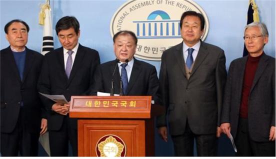 이종걸(왼쪽 두 번째부터)·강창일 더불어민주당 의원, 김무성·여상규 미래통합당 의원과 국민발안개헌연대 시민단체 대표들이 지난 11일(수) 서울 여의도 국회 정론관에서 국민발안 원포인트개헌 총선 동시 국민투표 촉구 기자회견을 하고 있다.(사진=뉴스1)