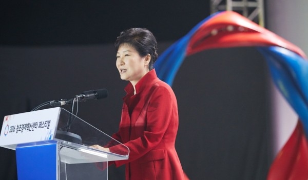 박근혜 대통령이 26일 오전 서울 한양대학교 올림픽체육관에서 열린 2016 창조경제혁신센터 페스티벌 개막식에서 모두 말을 하고 있다.(사진=청와대)