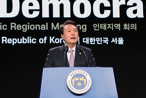 이날 서울 신라호텔에서 개최한 제2차 민주주의 정상회의 인도-태평양지역회의에 참석한 윤 대통령은 “이번 회의는 지정학적으로 중요성이 더욱 높아진 인태지역 국가들이 한자리에 모여 민주주의 수호 의지를 재확인하고 이정표를 마련한다는 점에서 의미가 크다”며 이같이 말했다.