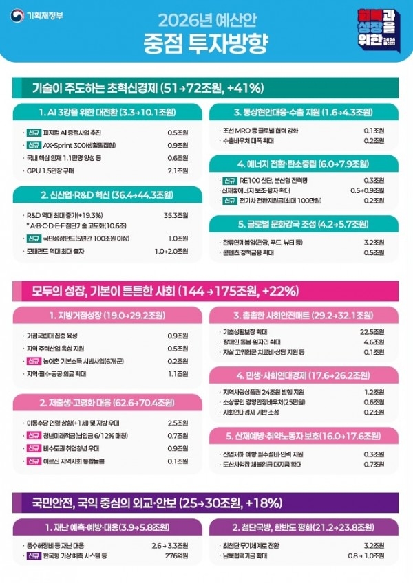 내년도 예산안은 이재명 정부가 편성한 첫 예산안으로 초혁신경제 등 성과를 낼 수 있는 부문에 집중 투자하고, 낭비성·관행적 지출 등은 과감히 구조조정해 성과 중심으로 재정을 운용할 계획이다.