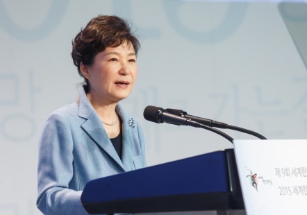 박 대통령은 이날 서울 그랜드워커힐호텔에서 열린 ‘제9회 세계한인의 날 및 2015 세계한인회장대회’에 참석, “10월 3일은 우리가 부러워하는 독일 통일 25주년이 되는 날이었다. 우리도 이제 70년 분단의 역사를 마감할 수 있어야 한다”며 이같이 밝혔다.