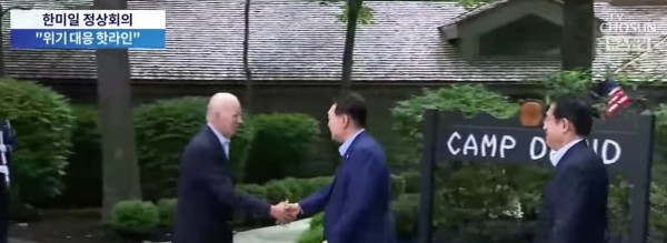 윤석열 대통령과 조 바이든 대통령, 기시다 후미오 일본 총리가 18일(현지시간) 워시텅DC 인근 미국 대통령 별장인 캠프 데이비드에서 열린 한미일 정상회의를 앞두고 로렐 로지 앞에서 조 바이든 대통령과 윤석열 대통령이 인사를 하고 있다.(사진=TV조선 뉴스캡처)