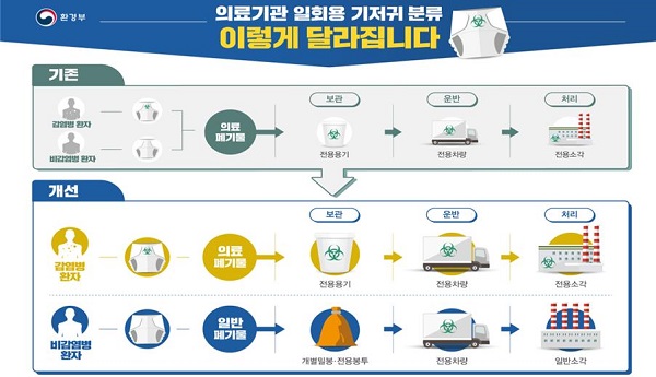 권병철 환경부 폐자원관리과장은 “기존에는 병원에서 발생하는 일회용기저귀가 모두 의료폐기물로 분류되어 의료폐기물 전용소각장에서만 처리할 수 있었으나, 이번 개정안이 시행되면 감염 우려가 없는 기저귀는 일반폐기물 소각장에서 처리될 것”이라면서 “의료폐기물 전용소각장의 부하를 줄이고 보다 안정적인 의료폐기물 처리기반을 마련할 수 있다”고 말했다.